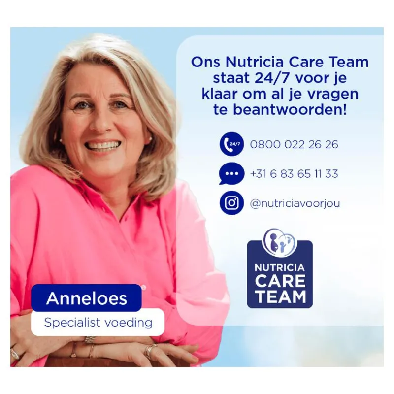 - Wij zijn er voor jou, zelfs om 3 uur ‘s nachts! Onze voedingskundigen staan 24/7 voor je klaar. Bel voor vragen de Nutricia Care Team op: 0800 022 26 26