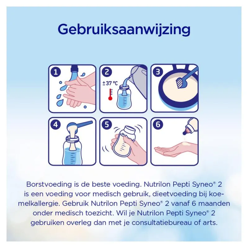 Nutrilon Pepti 2 is een dieetvoeding bij koemelkallergie, geschikt vanaf 6 maanden. Gebruik Pepti 2 alleen onder medisch toezicht. Borstvoeding is de beste voeding voor je baby.