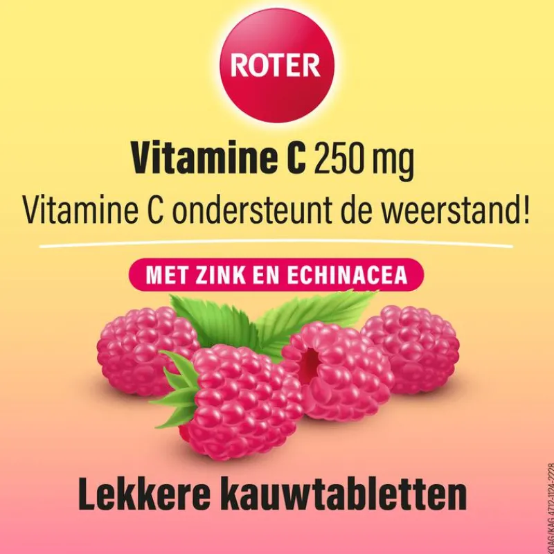 Roter Vitamine C Weerstand Framboos bevat per tablet 250 mg vitamine C aangevuld met Zink en Echinacea. Vitamine C kan je lichaam niet zelf aanmaken. Je moet deze vitamine via voeding binnenkrijgen. Vitamine C zit in groenten, fruit en aardappelen. Een aanvulling op de dagelijkse voeding in de vorm van vitamine C kan zinvol zijn. De kauwtabletten van Roter hebben een lekkere frambozenmaak en zijn handig zonder water in te nemen. Tevens zijn ze lactose- en glutenvrij.