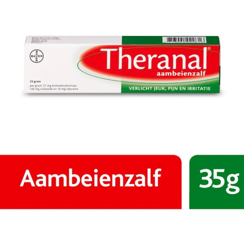 Theranal is een geneesmiddel dat gebruikt kan worden bij inwendige en uitwendige aambeien. Aambeien of hemorroïden zijn opgezwollen bloedvaatjes rondom de anus. Het opzwellen komt doordat er teveel druk op de bloedvaatjes komt te staan. Theranal verlicht snel de symptomen van aambeien zoals jeuk, pijn en irritatie èn zorgt dat de aambeien krimpen. Uiteindelijk zullen de aambeien verdwijnen.Theranal aambeienzalf is geschikt voor zowel inwendige als uitwendige aambeien. De zalf kan inwendig in de anus worden gebracht aan de hand van een makkelijk te gebruiken bijgevoegde canule. Uitwendig kan de zalf bijvoorbeeld met een watje op de aangedane plek worden aangebracht. De zalf kan ’s ochtends, ’s avonds en na iedere stoelgang worden gebruikt. Theranal zalf bevat de werkzame stoffen lidocaïne, zinkoxide en bismuthsubnitraat. Theranal is ook verkrijgbaar als zetpil, die alleen gebruikt kan worden voor inwendige aambeien. Beide varianten zijn zonder recept verkrijgbaar, maar als je langer dan 14 dagen klachten ervaart moet je een arts raadplegen. Voor zwangere vrouwen geldt dat ze Theranal alleen in overleg met een arts of verloskundige kunnen gebruiken.
