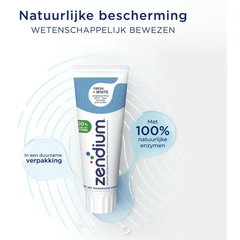 - Zendium Fresh+White Tandpasta bevat 100% natuurlijke enzymen