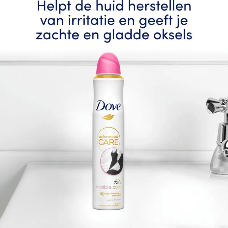 DOVE ADVANCED CARE INVISIBLE CARE ANTI-TRANSPIRANT DEODORANT SPRAY HEEFT EEN HEERLIJKE GEUR VAN WATERLELIE EN ROZEN EN BESCHERMT ZOWEL JE OKSELS ALS JE KLEDING.