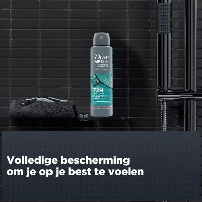 Dove Men+Care Advanced Eucalyptus + Mint Anti-Transpirant Deodorant Spray beschermt tot 72 uur lang tegen zweet en geurtjes, heeft een langdurig frisse geur en verzorgt je oksels. Het bieden van bescherming komt op de eerste plaats bij deze anti-transpirant spray. Gemaakt met de revolutionaire Triple Action Technologie is deze anti-transpirant ontworpen om je tot 72 uur lang tegen zweet te beschermen en je langdurig fris en zelfverzekerd te voelen. De effectieve anti-transpirant zorgt ervoor dat je je de hele dag beschermd voelt, zelfs op de heetste dagen. Daarnaast is deze Dove Men+Care anti-transpirant verrijkt met onze unieke 1/4 hydraterende crème die je okselhuid verzorgt. Irritaties door zweet of scheren behoren tot het verleden. Je krijgt een gehydrateerde en beschermde huid en gladde, comfortabel aanvoelende oksels.