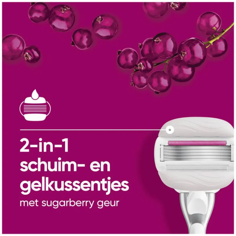 - Schuimt, scheert en exfolieert : 5 mesjes zorgen voor een gladde scheerbeurt dicht op de huid en de flexibele vochtinbrengende strips met Sugarberry-geur geven je huid de zorg die ze verdient