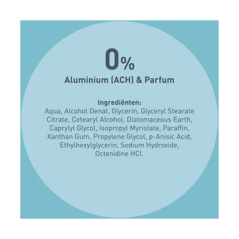 Deoleen deodorant 0% aluminium Regular bevat géén aluminium (ACH), parfum en laat geen witte strepen achter op je kleding. Deoleen 0% biedt 24 uur effectieve deo- bescherming op milde wijze en zorgt voor een schoon en fris gevoel. Het sterk absorberende mineraal Diatomecious Earth neemt transpiratievocht en -geur op effectieve wijze op.