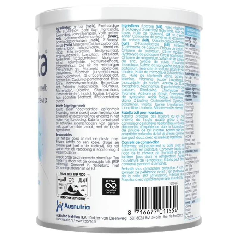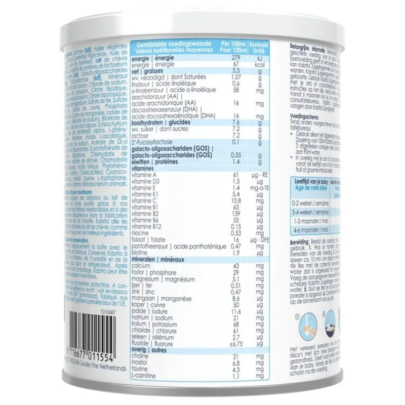 Ingrediënten: Lactose (MELK), Plantaardige oliën (1,3-Dioleoyl-2-palmitoyltriglyceride, Koolzaadolie, Zonnebloemolie), Volle geitenMELK, Geitenwei-eiwitconcentraat (MELK), Galacto-oligosachariden (MELK), 2′-Fucosyllactose (MELK), Mineralen (Calciumcarbonaat, Natriumchloride, Trinatriumcitraat, Kaliumchloride, Tricalciumfosfaat, Kaliumhydroxide, Trikaliumcitraat, Magnesiumchloride, IJzersulfaat, Zinksulfaat, Kopersulfaat, Mangaansulfaat, Kaliumjodide, Natriumselenaat), Cholinebitartraat, Fruto-oligosachariden, Olie van de microalg Schizochytrium sp., Mortierella alpina olie, L-fenylalanine, Vitaminen (L-ascorbinezuur, Natrium L-ascorbaat, DL-伪 tocoferylacetaat, Niacinamide, Calcium D-pantothenaat, Riboflavine, Thiaminehydrochloride, Pyridoxinehydrochloride, Retinylacetaat, Foliumzuur, Fytomenadion, D-biotine, Cholecalciferol, Cyanocobalamine), Inositol, Taurine, L-tryptofaan, L-carnitine L-tartraat, Bifidobacterium animalis.