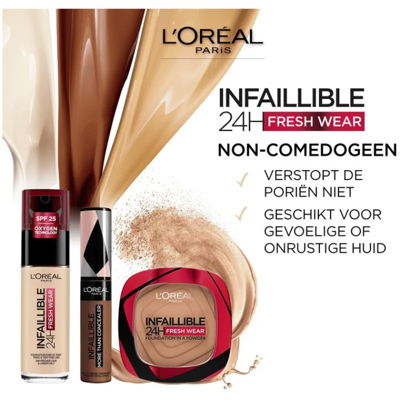 Ontdek de kracht van de L’Oréal Paris Infaillible 24H Fresh Wear Foundation in poedervorm. Deze poeder combineert het beste van beide werelden: de dekking van een foundation en het gemak van een poeder. De formule is doordrenkt met ultrafijne kleurpigmenten die zich aan je huid hechten voor een langdurige dekking zonder het gevreesde maskereffect. Met deze foundation in poedervorm bereik je moeiteloos een natuurlijke, egale finish die de hele dag blijft zitten. Het matteert de huid en camoufleert oneffenheden net zo effectief als een vloeibare foundation, maar dan met het comfort en de handigheid van een poeder. Bovendien is de Infaillible 24H Fresh Wear Foundation in a Powder ontworpen om niet af te geven en voelt het heerlijk comfortabel aan op de huid. Verwen jezelf met een langdurige, natuurlijke look die perfect past bij jouw levensstijl. Met deze foundation in poedervorm hoef je nooit meer compromissen te sluiten tussen dekking, comfort en gemak. Omdat je het waard bent.