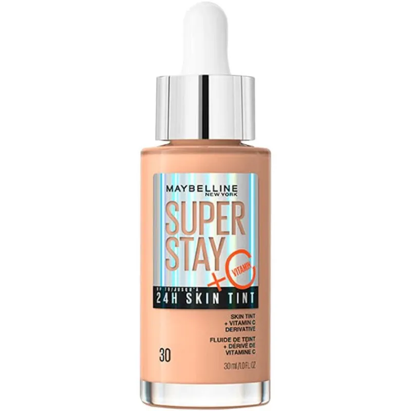 Jouw huid glow-up met Superstay 24H Skin Tint! Deze foundation van Maybelline New York geeft een stralende, skin-like finish. De formule verrijkt met vitamine C* houdt tot 24 uur** en biedt opbouwbare dekking. De lichte textuur van de vloeibare foundation egaliseert de teint en zorgt voor een frisse, natuurlijke look. Superstay 24H Skin Tint is verkrijgbaar in 20 tinten, geschikt voor alle huidtinten en -types. De lichte, geteste formule laat de huid ademen. Gebruik 1 tot 2 druppels voor een lichte dekking en voeg meer druppels toe voor een medium dekking. Vanuit het midden van het gezicht naar buiten toe uitsmeren met de vingers, een kwastje of een sponsje.*Vitamine C-derivaat **Consumententest, 110 personen