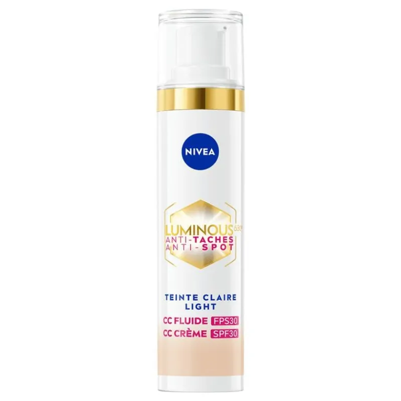 De NIVEA Luminous630® Anti-Spot CC Crème Fluid met SPF 30 perfectioneert je teint dankzij een drievoudige werking. 1. De huidtint aanpassende micro-ingekapselde pigmenten zorgen voor een natuurlijk ogende dekking en egaliseren direct donkere vlekjes en oneffenheden. 2. De formule met luminous630® vermindert zichtbaar pigmentvlekken in 2 weken en egaliseert de teint met + 40% in 8 weken.* 3. De formule met spf30 beschermt tegen de zon en voorkomt dat nieuwe pigmentvlekken opnieuw verschijnen. Een baanbrekende innovatie. Na 10 jaar onderzoek en de screening van meer dan 50.000 ingrediënten hebben NIVEA wetenschappers luminous630® ontdekt. Brengt pigmentatie op celniveau in balans om pigmentvlekken te verminderen en helpt voorkomen dat ze opnieuw verschijnen. *Zelfbeoordeling, 12 weken durend onderzoek bij 51 vrouwen, 2023