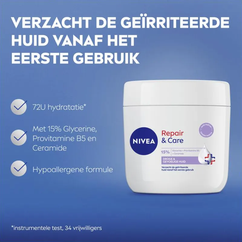 Op zoek naar een crème die je droge en gevoelige huid direct kalmeert? NIVEA Repair & Care Crème zonder parfum verzorgt en verzacht de huid vanaf het eerste gebruik. De formule verlicht vijf tekenen van huidirritatie: droogheid, jeukerig gevoel, roodheid, irritatie en trekkerigheid. Met 15% Glycerine, Provitamine B5 en Ceramide biedt deze crème intensieve hydratatie en helpt de huidbarrière te herstellen. Speciaal ontwikkeld voor de droge en gevoelige huid, hypoallergeen en geurvrij. De lichte textuur is niet-vettig, trekt snel in en is geschikt voor dagelijks gebruik op gezicht, lichaam en handen. Ook geschikt voor kinderen vanaf 3 jaar. Dermatologisch goedgekeurd.