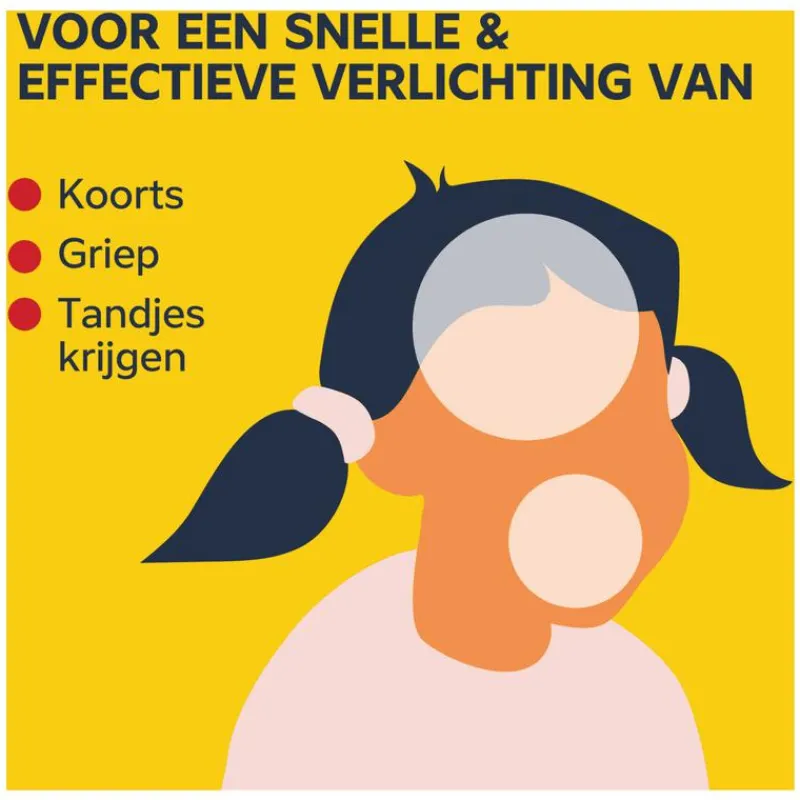 Niet gebruiken bij allergie voor één van de stoffen in dit geneesmiddel. Niet geschikt voor kinderen jonger dan 6 jaar of lichter dan 20 kilogram. Als het kind overgevoelig is voor ibuprofen of vergelijkbare pijnstillers (NSAID’s) of het heeft na gebruik van acetylsalicylzuur (aspirine) of soortgelijke pijnstillers (NSAID’s) een astma aanval, kortademigheid, loopneus, zwelling gezicht en/of handen of netelroos gehad. Als het kind lijdt aan een maagdarmbloeding of -perforatie na eerder gebruik NSAID’s of last heeftvan terugkerende maag- of twaalfvingerige darmzweer, hartfalen, lever- of nierfalen, hersenbloeding of andere actieve bloeding, bloedingsstoornissen of stoornis in de bloedaanmaak, ernstige uitdroging of erfelijke problemen bij het verwerken van fruitsuikers.,Indicatie: Voor een kortstondige behandeling van de symptomen koorts en lichte tot matige pijn.