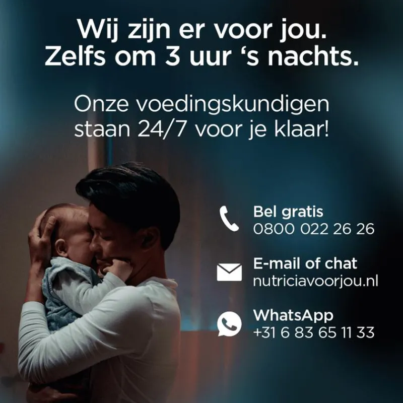 - Wij zijn er voor jou, zelfs om 3 uur ‘s nachts! Onze voedingskundigen staan 24/7 voor je klaar. Bel voor vragen de Nutricia Kindervoeding Service op: 0800 022 26 26