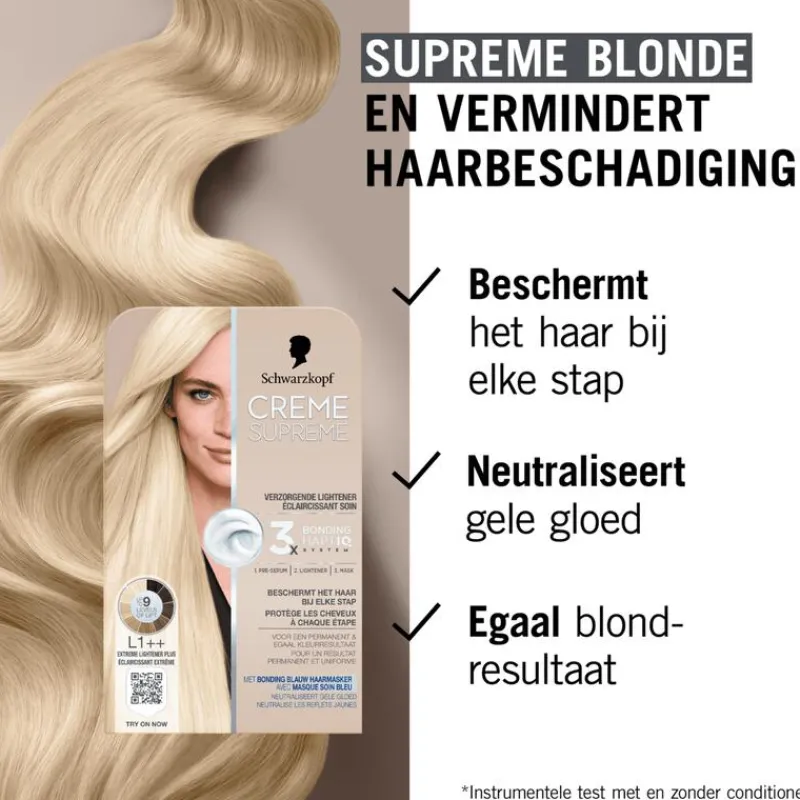 Meer dan 120 jaar geleden legde de Duitse chemicus en apotheker Hans Schwarzkopf de basis voor een merk dat sindsdien altijd voorop heeft gelopen op het gebied van innovatie. De combinatie van kwaliteitsingrediënten en de nieuwste haarverzorgingstechnologie, betrouwbaarheid, expertise en vakmanschap zijn de hoekstenen van alles wat het merk doet en waar het voor staat. Creme Supreme is de meest verzorgende permanente haarkleuring van Schwarzkopf, met het 3x Bonding HAPTIQ System dat het haar beschermt bij elke stap : voor, tijdens en na het kleuren.