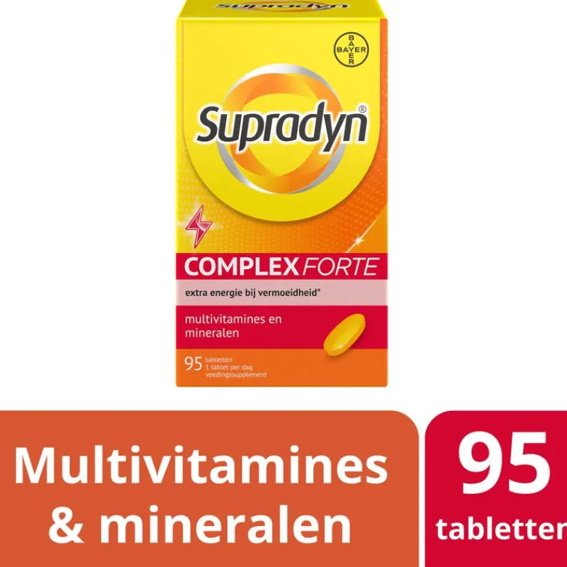 Sta actief in het leven! Supradyn Complex Forte geeft je als aanvulling op de voeding een steuntje in de rug tijdens veeleisende periodes waarin je de extra energie bij vermoeidheid goed kunt gebruiken**, zoals drukte op je werk, als je weerstand op de proef wordt gesteld, de combinatie werk/gezin. Neem als aanvulling op je dagelijkse voeding een hoog gedoseerde tablet van Supradyn Complex Forte. ; *De vitamines B2, B3, B5, B6, B12, C, het mineraal magnesium en het sporenelement ijzer activeren extra energie bij vermoeidheid. ; **Multiscope marktpeiler 2016 ; ***Vergeleken met Supradyn Complex Energy; ruim onder de maximaal veilige hoeveelheid.