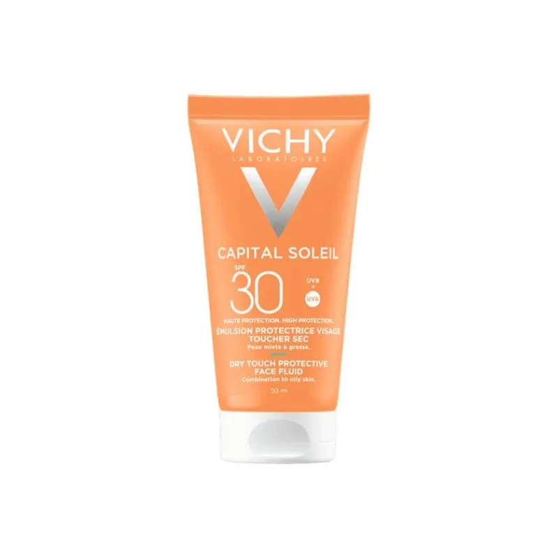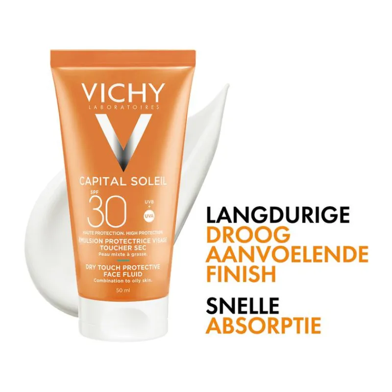 Vichy Capital Soleil Dry Touch Zonnecrème SPF30 is een matterende zonnebrand met factor 30 en matte finish ideaal voor een vette huid. Zeer aangename verzorging voor dagelijks gebruik, deze zonnebrandcrème met hoge factor waardoor je (bij regelmatig gebruik) minder risico loopt op vroegtijdige huidveroudering door de zon.