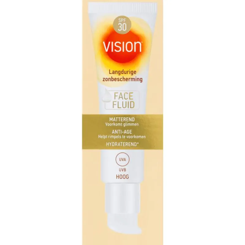 Vision Face Fluid SPF 30Langdurige zonbescherming voor je gezicht. Anti-age, matterend en hydraterend*.*met hydraterende bestanddelen• Langdurige zonbescherming voor je gezicht • Matterend: voorkomt glimmen• Anti-age: helpt rimpels te voorkomen• Met hydraterende bestanddelen• Zeer waterbestendig• Met 5-sterren UVA-bescherming • Met LipoDefense TechnologyTMWe houden allemaal van de zon, maar zijn ons ook bewust van de schadelijke effecten. Je gezicht wordt heel vaak blootgesteld aan zonlicht en verdient daarom extra aandacht. Vision Sun Face Fluid is het ideale zonproduct voor je gezicht. De complete All-in-1 formule matteert en hydrateert de huid én helpt huidveroudering te voorkomen dankzij extract van gouden zeewier. De optimale balans tussen UVA- en UVB-filters zorgt voor een zeer hoge bescherming tegen de zon en helpt rimpels te voorkomen. Daarnaast is de Face Fluid ook perfect te combineren met cosmetica.*met hydraterende bestanddelen