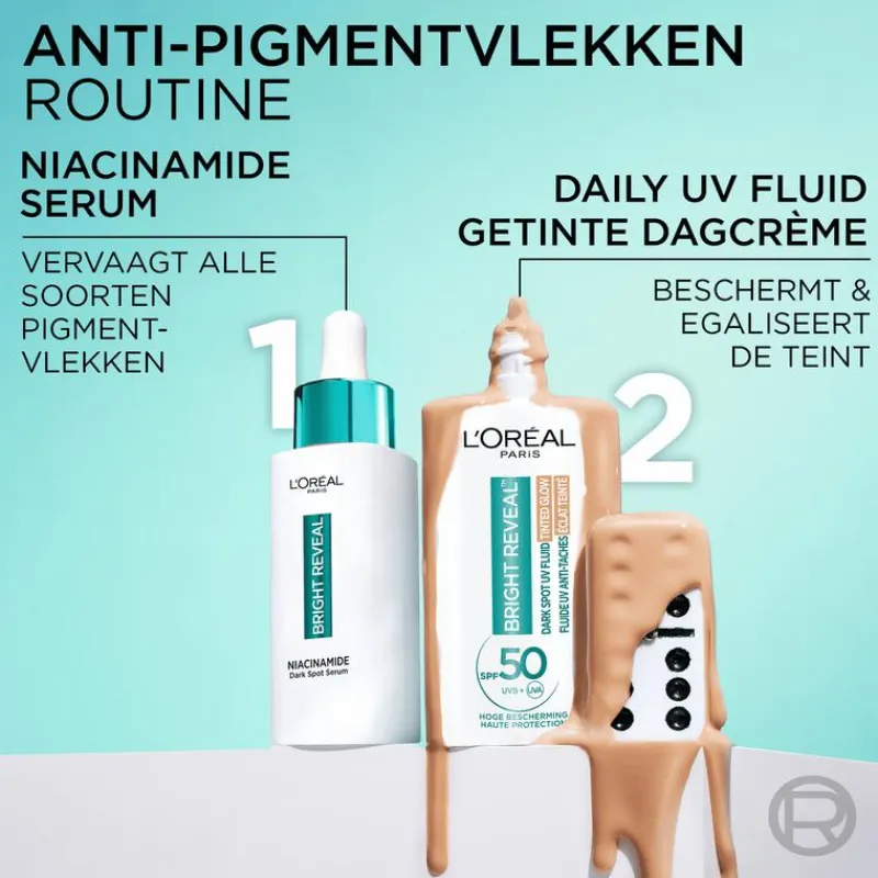 Ontdek de L’Oréal Paris Bright Reveal Daily UV Fluid Tinted Glow. Deze fluid beschermt, voorkomt en vermindert pigmentvlekken met behulp van niacinamide, LHA en glow pigmenten. Dagelijkse UV-bescherming is essentieel voor vermindering van pigmentvlekken en de effectiviteit van deze fluid is klinisch bewezen*. De Bright Reveal fluid beschermt, egaliseert en vermindert zichtbaar pigmentvlekken. Na één gebruik voelt de huid gehydrateerd aan en ziet er onmiddellijk egaler, helderder en stralender uit. Na één maand zijn pigmentvlekken zichtbaar vervaagd, is de huid egaler en ziet er jonger uit. De Bright Reveal UV Fluid Tinted Glow biedt een natuurlijke dekking met een stralende finish. De formule is niet vet, niet plakkerig en geschikt voor de gevoelige huid. Getest onder dermatologische controle. *Klinische test, klinische score, 4 weken, 42 proefpersonen en zelfevaluatie, 4 weken, 79 proefpersonen.