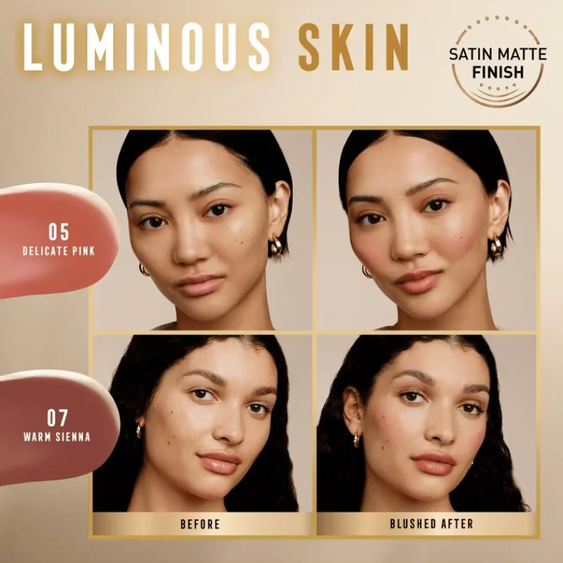 - Deze vloeibare blush heeft een zeer lichte formule en is sterk gepigmenteerd voor geweldige kleuren, voor een stralende look met een satijnachtige, matte finish.