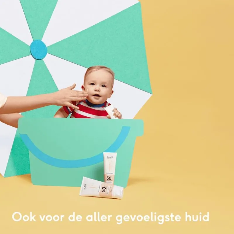 Naïf Zonnebrandcrème voor Baby & Kids SPF50 zorgt voor een hoge bescherming van de kwetsbare baby- en kinderhuid tegen UVA en UVB straling. De huidvriendelijke formule is op basis van het mineraal zinkoxide. Een minerale filter legt een laagje op de huid, wat ervoor zorgt dat de zonnestralen meteen worden weerkaatst. Zo is de huid direct beschermt zonder inwerktijd én is de kans op huidirritatie minimaal. Dit maakt een minerale UV filter zeer geschikt voor kinderen met een gevoelige huid. De zonnebrand smeert goed uit, dankzij natuurlijke oliën van olijf en zonnebloem. Daarnaast bevat de crème meer oliën vergeleken met een lotion, wat ervoor zorgt dat uitdroging van de huid wordt voorkomen. Ook fijn: de crème is waterbestendig. Dus spetteren maar! We adviseren baby’s met name het eerste jaar zoveel mogelijk uit de zon te houden. Mocht het toch voorkomen, is Naïf Zonbescherming ook veilig te gebruiken voor de gevoelige huid van pasgeboren baby’s. Alle producten van Naïf zijn gemaakt met natuurlijke ingrediënten, vegan en dermatologisch getest. Ook bevatten ze geen microplastics.