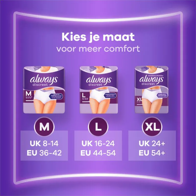 Laat incontinentie je er niet van weerhouden om actief te zijn. Met Always Discreet broekjes voor urineverlies Plus L kan jij volop van je dag genieten, zelfs bij veel urineverlies veroorzaakt door plotselinge aandrang. De superabsorberende broekjes zijn voorzien van RapidAbsorb technologie die urineverlies en geurtjes in enkele seconden helpt te absorberen en vast te houden. De dubbele LeakGuards beschermingsrandjes helpen lekken te vermijden daar waar ze het meeste voorkomen. Hun 360° FormFit-design en hun kern bieden een optimale en comfortabele pasvorm zodat je voluit van het leven kan genieten met een bescherming die je ongelooflijk goed past. Probeer Always Discreet broekjes voor urineverlies Plus L. Ook geschikt voor incontinentie na de bevalling. Ben je op zoek naar verschillende kleuren en optimale discretie? Kies dan Always Discreet Boutique broekjes, verkrijgbaar in zwart en beige.