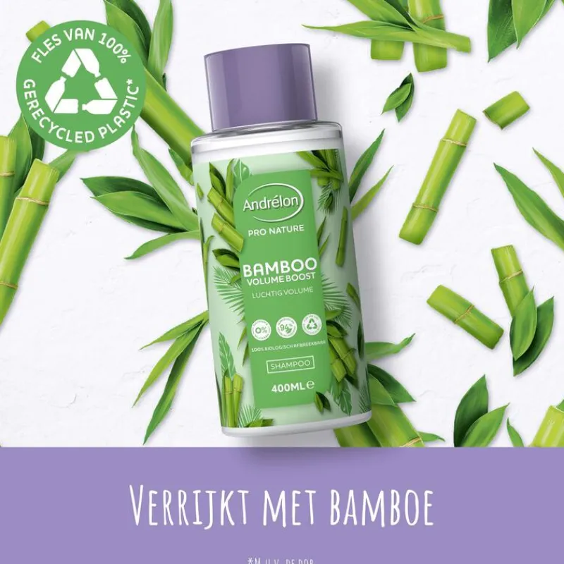 ANDRÉLON PRO NATURE BAMBOO VOLUME BOOST SHAMPOO, VERRIJKT MET BAMBOE, HYDRATEERT FUTLOOS HAAR EN GEEFT LUCHTIG VOLUME MET EEN PRACHTIGE NATUURLIJKE GLANS.• Andrélon Pro Nature Bamboo Volume Boost Shampoo voor intensieve hydratatie• De shampoo bevat geen sulfaten en siliconen en is verrijkt met bamboe• Geeft futloos haar luchtig volume met een prachtige natuurlijke glans• De Bamboo Volume Boost Shampoo is 100% biologisch afbreekbaar• Shampoo gemaakt met 94% ingrediënten van natuurlijke oorsprong*• De fles van deze shampoo is recyclebaar en is 100% gerecycled** plastic