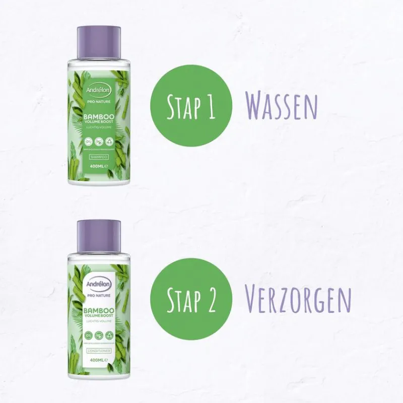 Gebruik voor een optimaal resultaat en voeding van je haar ook de Andrélon Pro Nature Bamboo Volume Boost Conditioner. Hoe het werkt? Knijp, masseer het schuim in je haar en spoel het uit.