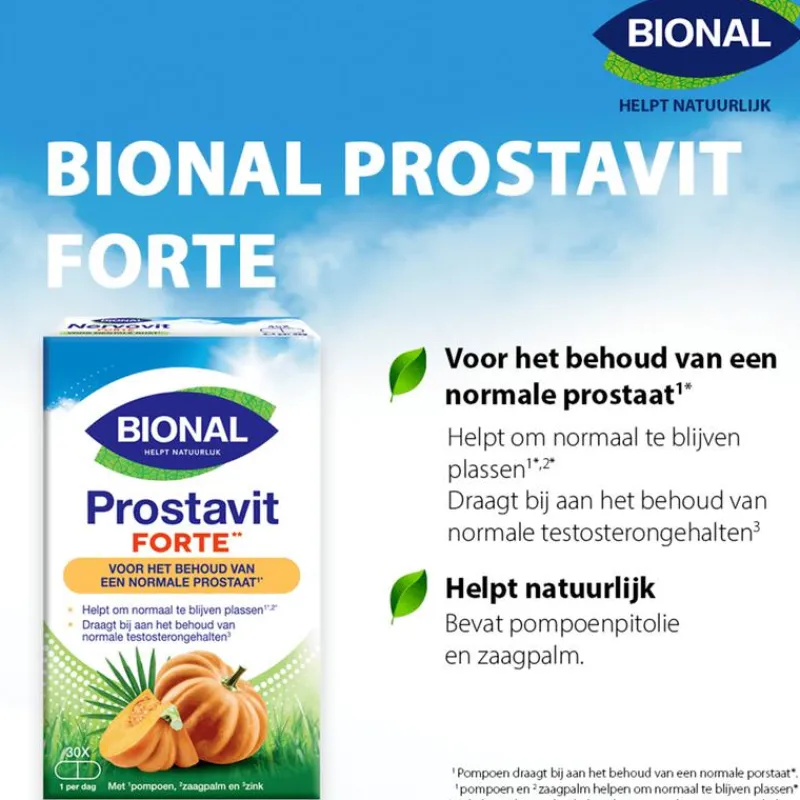 Moeite met goed plassen? Op oudere leeftijd kan de prostaat groter worden, dat kan het plassen beïnvloeden. Het behoud van een normale prostaatfunctie is daarom van belang. Bional Prostavit Forte bevat pompoenpitolie en zaagpalmextract dat goed is voor de prostaatfunctie en helpt om goed te kunnen blijven plassen. Daarnaast bevat het zink dat bijdraagt aan de instandhouding van normale testosterongehalten in het bloed.