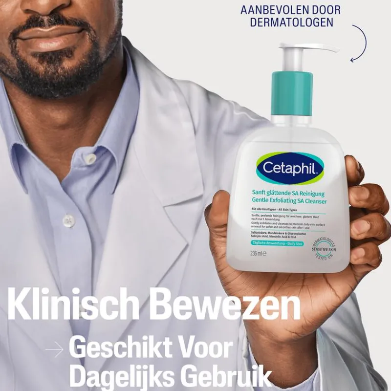 Vanaf nu is er een mild exfoliërende cleanser beschikbaar die elke dag gebruikt kan worden, zelfs met een gevoelige huid. Cetaphil Gentle Exfoliating SA Cleanser zorgt voor een zachtere, gladdere huid en een egalere teint in slechts 1 week dankzij een unieke mix van salicylzuur,amandelzuur en gluconolactone.Deze milde cleanser bevordert de vernieuwing van de oppervlakkige huidcellen voor een verfijndere textuur en een stralend uitziende huid na slechts 1 keer gebruik, zonder dezelfde schurende werking als een scrub. Dagelijks gebruik kan zelfs helpen om de veerkracht van de gevoelige huid na verloop van tijd te verbeteren. Bovendien hydrateert een mix van Niacinamide (vitamine B3), Panthenol (vitamine B5) en Glycerine de huid om de huidbarrière te helpen verzachten en in tact te houden.Deze schuimende gel cleanser is hypoallergeen, parfumvrij en verstopt de poriën niet. CETAPHIL Gentle Exfoliating SA Cleanser beschermt tegen 5 tekenen van een gevoelige huid: Droogheid, irritatie, ruwheid, trekkerigheid en een verzwakte huidbarrière.