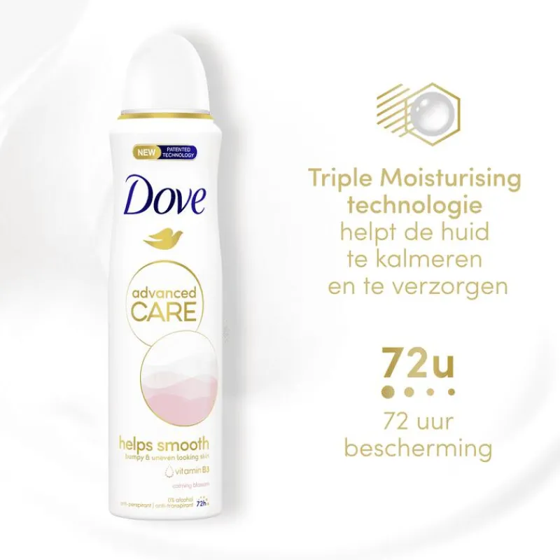 DOVE ADVANCED CARE CALMING BLOSSOM ANTI-TRANSPIRANT DEODORANT SPRAY MET VITAMINE B3 BESCHERMT TEGEN ZWEET EN VERZORGT DE HUID.• Dove Advanced Care Calming Blossom Anti-Transpirant Deodorant Spray• Verzorgt en hydrateert de huid en biedt tot 72 uur bescherming tegen zweet• Met Vitamine B3 voor een zachtere, gladdere en egaler uitziende huid• De spray bevat een verbeterde formule met Triple Moisturising technologie• Een anti-transpirant deodorant spray met een subtiele geur van bloesems• Dove anti-transpirant deodorants dragen het PETA-approved keurmerk
