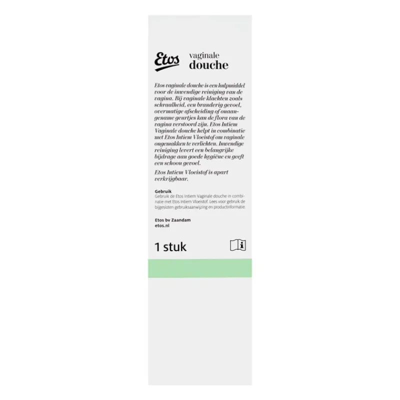 Etos vaginale douche is een hulpmiddel voor de inwendige reiniging van de vagina. Bij vaginale klachten zoals schraalheid, een branderig gevoel, overmatige afscheiding of onaangename geurtjes kan de flora van de vagina verstoord zijn.