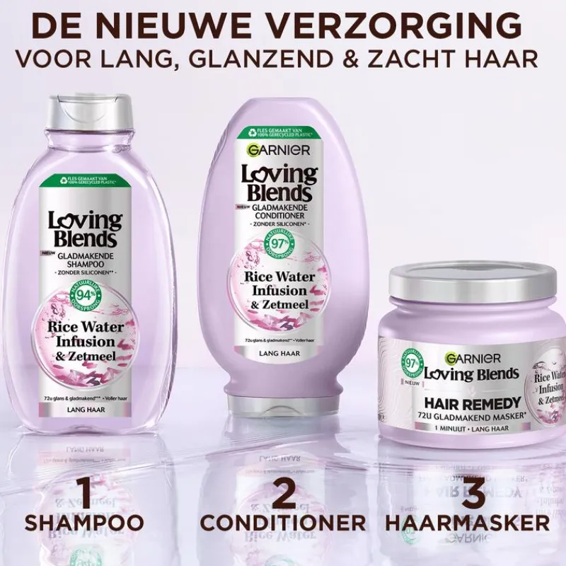 De conditioner werkt als een remedie om lang haar voller te maken met hydratatie. De haarschubben zijn hersteld waardoor ze weer in staat zijn om licht te reflecteren. Het volledige Loving Blends Rice Water is ook geschikt voor lang haar. Ontdek voor nog meer verzorging ook de bijhorende shampoo en masker.