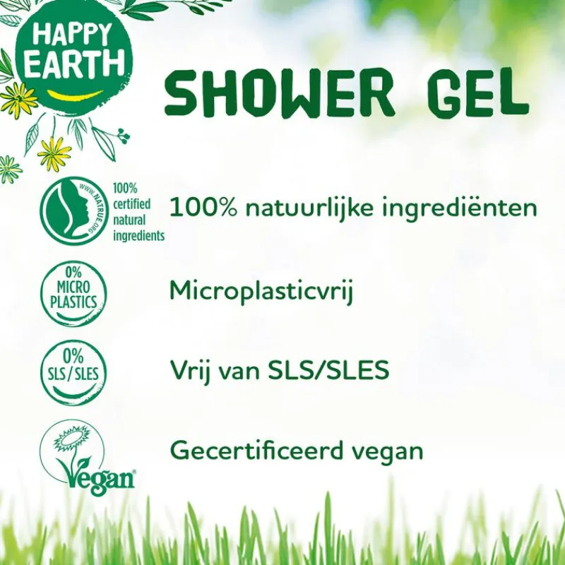 In HAPPY EARTH SHOWER GEL gebruiken we alleen ingrediënten waar jouw huid blij van wordt. Als je iets op je huid aanbrengt en door het doucheputje spoelt, is het fijn om te weten dat er geen vervuilende en vervelende ingrediënten in zitten zoals SLS/SLES, parabenen, kleurstoffen of andere nare toevoegingen. Daarom dragen wij met trots de keurmerken van NATRUE en Vegan Society. En onze shower gel-flessen zijn gemaakt van 100% gerecycled plastic. Zo zorg je niet alleen goed voor jezelf maar ook voor onze aarde!