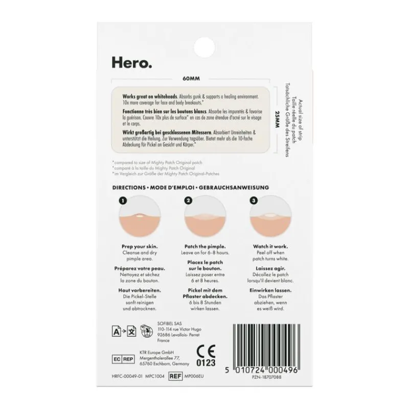 “Niet uitknijpen. Mighty Patch je puist.Deze bewezen hydrocolloïde patch verwijdert moeiteloos de viezigheid in slechts 6-8 uur, terwijl de huid wordt beschermd tegen korstjes en littekens die worden veroorzaakt door puistjes. Plak de patch gewoon op en chill (of slaap) – en word wakker met een egalere huid. Voila: merkbaar kleinere, plattere puistjes.Mighty Patch The Original is veilig, zacht en niet-irriterend voor alle leeftijden en huidtypes. Gemaakt van hydrocolloïd van medische kwaliteit – een vochtabsorberende gel – vrij van chemicaliën, dermatologisch getest en geschikt voor de gevoelige huid.”