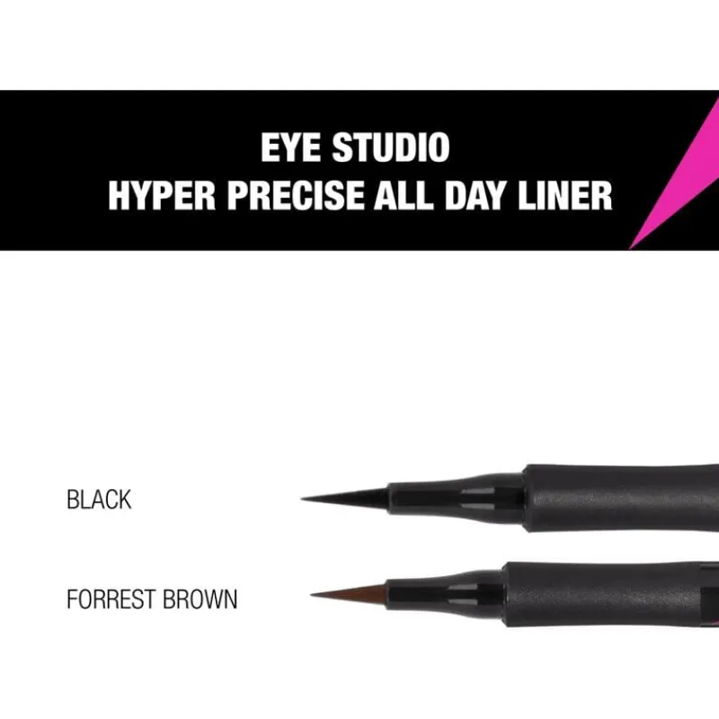 Eye Studio Hyper Precise All Day Liner is de meest precieze vloeibare eyeliner van Maybelline New York. Dankzij de nauwkeurige punt van 0,4mm creëer je gemakkelijk een dunne, strakke lijn. Laat je creativiteit de vrije loop en creëer de meest schitterende looks met deze Hyper Precise Eyeliner All Day Liner 001 Forest Brown. De eyeliner is van naam veranderd van Master Precise naar Hyper Precise, maar is verder hetzelfde. Hierdoor krijg je jouw vertrouwde eyeliner nu thuis met de naam Hyper Precise.