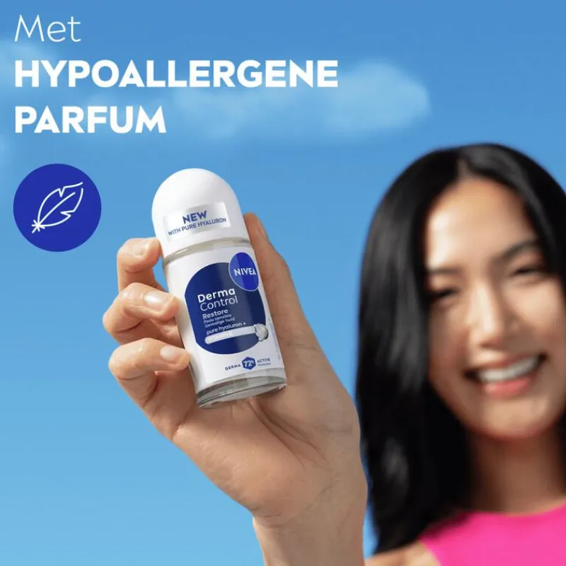NIVEA Derma Control Restore Deodorant Roller biedt 72 uur* betrouwbare anti-transpirant bescherming en is speciaal ontwikkeld voor de gevoelige huid. De formule met Pure Hyaluron en Vitamine E kalmeert effectief de geïrriteerde huid na het scheren en draagt bij aan zachtere, mooiere oksels en langdurig comfort. Geschikt voor dagelijks gebruik, met hypoallergene parfum en zonder ethylalcohol. De huidverdraagzaamheid is dermatologisch getest, zodat je met een gerust hart kunt vertrouwen op langdurige zweet- en geurbescherming. Anti-irritatie en anti-bacterieel**. Deze roller combineert effectieve bescherming met actieve huidverzorging, zodat je huid de hele dag fris, verzorgd en gezond aanvoelt. *Instrumentele test, 22 vrijwilligers **in-vitro test op bacteriën die geurtjes veroorzaken.