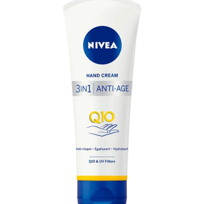 Probeer deze NIVEA 3-in-1 formule, die een lang werkend anti age effect heeft en verrijkt is met Q10 en verzachtende glycerine vloeistof. NIVEA 3-in-1 Q10 Anti-Age Handcrème geeft een fris gevoel en maakt je handen jonger. Ook de ideale handverzorging voor wie vaak met de handen werkt, zoals klussers en ander hobbyisten. Q10 is een huideigen co-enzym dat de energieproductie in cellen stimuleert. Naarmate je ouder wordt, neemt de hoeveelheid Q10 in de huid af, wat leidt tot veroudering, verslapping en rimpels. NIVEA vult de Q10 aan, waardoor de huid gladder, steviger en jeugdiger oogt. Daarom heeft NIVEA dit ingrediënt in haar producten verwerkt.