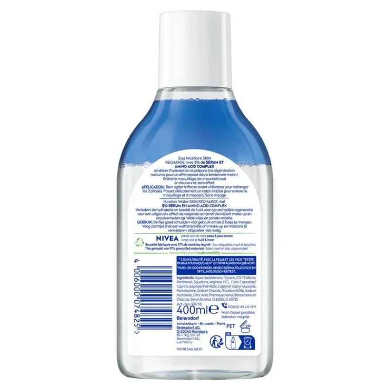 NIVEA Micellar Water Skin Recharge voor vermoeide en gevoelige huid is verrijkt met Aminozuurcomplex en 5% Serum met Panthenol & Squalaan. Het verwijdert waterproof make-up, onzuiverheden en vuil op milde wijze en zonder moeite en laat geen vettig laagje achter. Wrijven is niet nodig, dus het reinigt de huid heel zacht. Het herstelt het vochtgehalte en regenereert, waardoor de huid ’s nachts wordt voorbereid op regeneratie voor een mooie en uitgerust ogende huid de volgende ochtend. Het regenererende effect is klinisch getest.