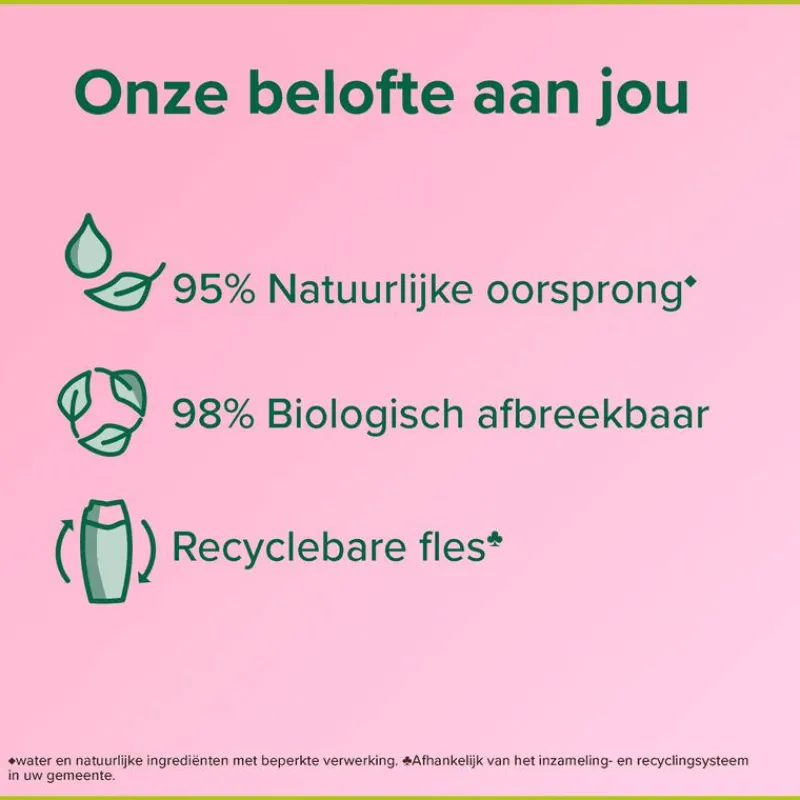 Deze vegan douchegel is gemaakt met ingrediënten van 95% natuurlijke oorsprong* en heeft een formule die voor 95% biologisch afbreekbaar is. De fles bestaat voor 30% uit gerecycled plastic en is volledig recyclebaar.
