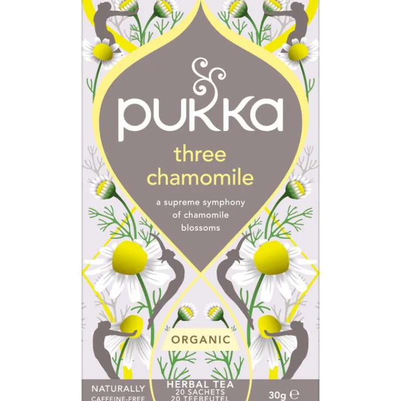 Rustgevend en omhullend, relax en geniet van de zoete, bloemige smaak van Three Chamomile thee van Pukka.