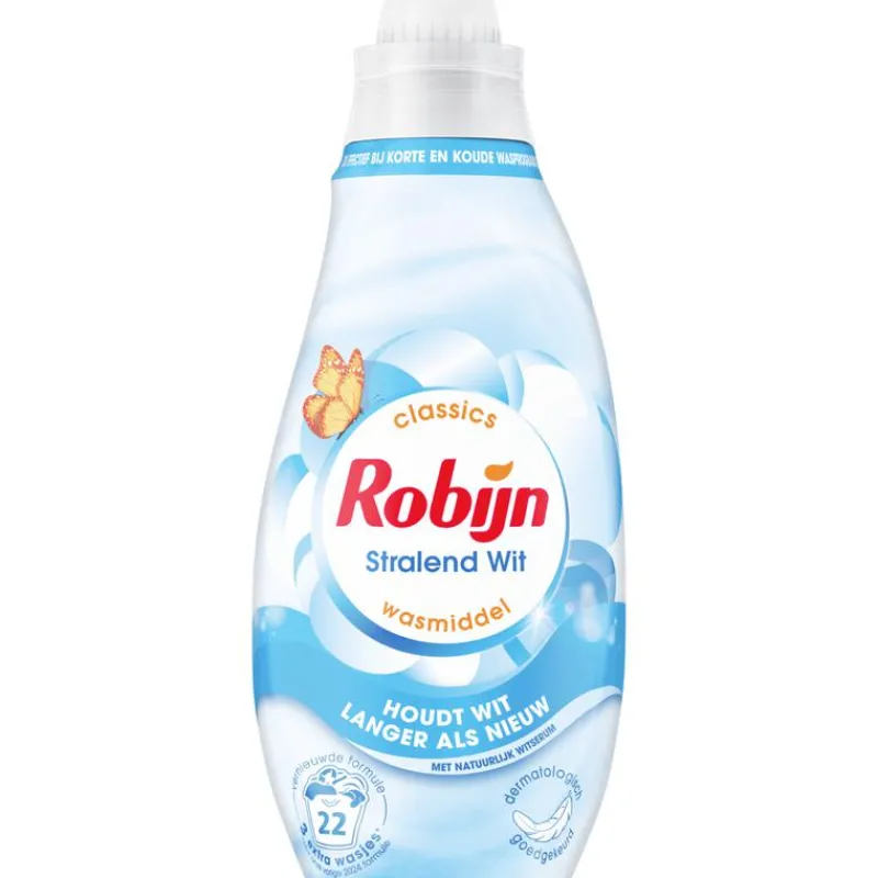 Robijn Klein & Krachtig Classics Stralend Wit Vloeibaar Wasmiddel is speciaal ontwikkeld voor de lichte en witte was. Het laat je was heerlijk ruiken en zorgt ervoor dat je witte kleding lang mooi blijft. Dit dermatologisch goedgekeurde wasmiddel met natuurlijk witserum zorgt ervoor dat je witte was langer wit blijft, omdat het de vergrauwing van je kleding voorkomt. Het levert uitstekende resultaten, zelfs in koude (20 °C) en korte (30 minuten) wasbeurten, dankzij de verbeterde waskracht en vlekverwijdering.