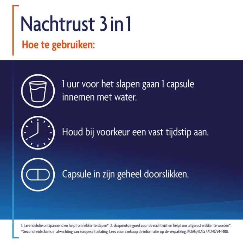 Geeft ontspanning dat helpt om lekker te slapen¹*. Ondersteunt het behoud van een gezonde nachtrust²*. Helpt uitgerust wakker worden³*. *Gezondheidsclaim in afwachting van Europese toelating.