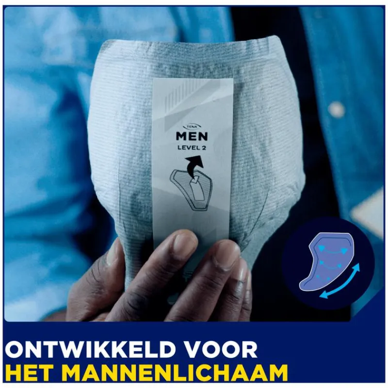 TENA MEN ACTIVE FIT LEVEL 2 is speciaal ontworpen voor het MANNELIJKE LICHAAM en biedt discrete bescherming bij MATIG URINEVERLIES.