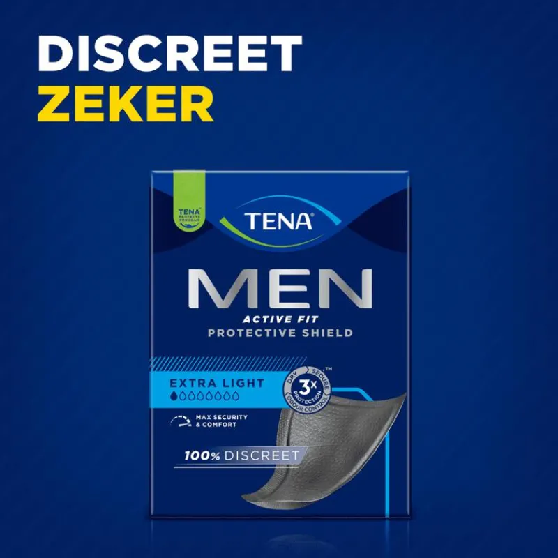 GEEN DRUPPELDRAMA’S MEER met TENA MEN ACTIVE FIT PROTECTIVE SHIELD – BESCHERMING TEGEN LICHT URINEVERLIES, geurtjes en vocht. Deze COMFORTABELE EN DISCRETE incontinentiebeschermers zijn slechts 3 MM DUN, komen in SUBTIEL ZWART en absorberen licht urineverlies voor een FRIS EN ZELFVERZEKERD GEVOEL.Speciaal ontwikkeld voor het MANNELIJKE LICHAAM, met een IETS DRIEHOEKIGE VORM en een VEILIGE ABSORPTIEZONE die vocht effectief vasthoudt. De schilden zijn apart verpakt voor GEMAK en blijven stevig op hun plek dankzij de PLAKSTRIP. Zodra het vastzit, vergeet u dat het er is.Blijf ACTIEF ZONDER ZORGEN, of u nu in de SPORTSCHOOL, op KANTOOR of onderweg bent.
