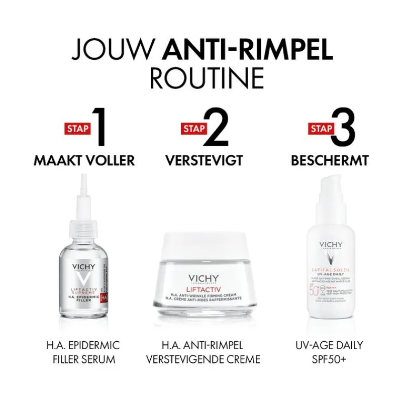 VICHY LIFTACTIV H.A. ANTI-RIMPELS VERSTEVIGENDE CRÈME DROGE TOT ZEER DROGE HUID 50ml is een lichte, comfortabele anti-aging dagcrème die gelijk in de huid smelt. Het geeft de hele dag lang een fris gevoel aan het huidoppervlak. Niet-plakkerig, niet-vettig. Deze dagcrème biedt langetermijnresultaat, maar vooral direct effect: nu, vanavond, morgenochtend na het ontwaken. Vichy’s nieuwe generatie in dagverzorging is erop gericht dagelijkse huidveroudering in een handomdraai terug te draaien. Hiernaast is LIFTACTIV H.A. een ideale dagcrème voor onder zonnebrandcrème of make-up. Er is voor een geur gekozen die het risico op allergie zoveel mogelijk minimaliseert.