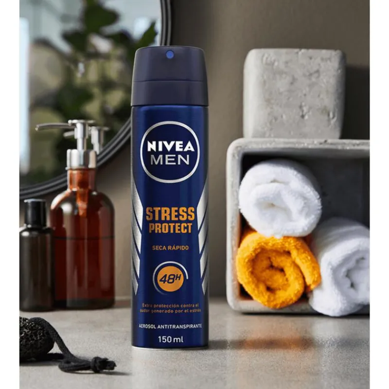 NIVEA MEN Stress Protect Anti-Transpirant Spray biedt betrouwbare bescherming tegen zweet en lichaamsgeur, zelfs in de meest stressvolle situaties. De innovatieve formule bevat Stress Protect-actieve stoffen en een Zinkcomplex, die samenwerken om zweet effectief te reguleren en ongewenste geuren te voorkomen. Dit maakt het de perfecte deo spray voor mannen die dagelijks worden blootgesteld aan stressvolle omstandigheden, zoals werkdruk of fysieke activiteiten.Onze anti-transpirant voor mannen biedt Derma 72u Active Protection, wat betekent dat het langdurige en krachtige bescherming biedt tegen zweet en geuren, terwijl het samenwerkt met je huid voor een comfortabele, frisse ervaring. De huidvriendelijke formules zijn dermatologisch getest, wat betekent dat ze zacht voor je huid zijn en geen irritaties veroorzaken, zelfs bij dagelijks gebruik. Deze deodorant voor mannen houdt je huid droog en geurvrij, zonder vervelende vlekken op je kleding.Met NIVEA MEN Stress Protect Spray ben je voorbereid op elke stressvolle situatie, met de zekerheid dat je fris en droog blijft. De formule voorkomt niet alleen geur, maar beschermt ook tegen zweetvlekken, zodat je er altijd op je best uitziet. Kies voor deze anti-transpirant spray voor mannen en ervaar de ultieme bescherming, zelfs onder druk.
