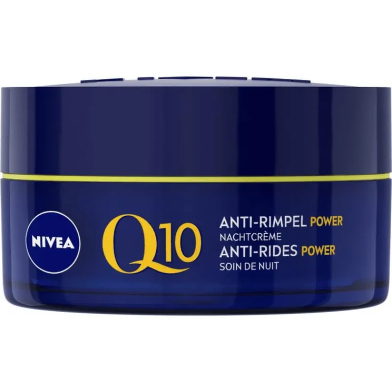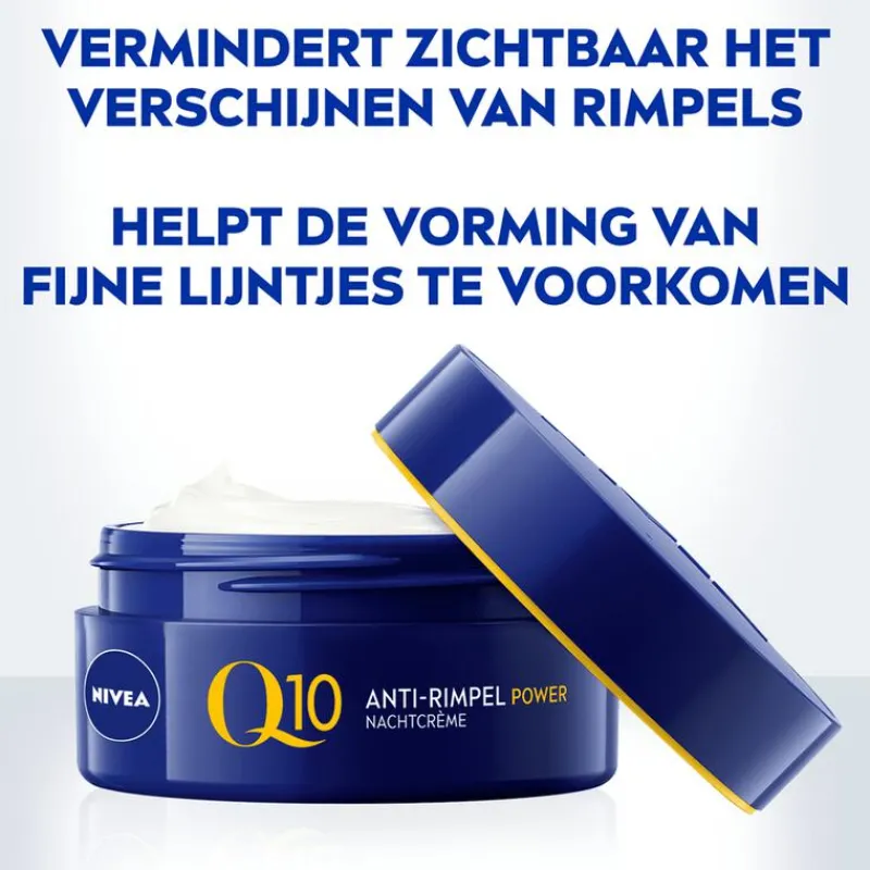 Verstevig de huid en laat rimpels zichtbaar verdwijnen met NIVEA Q10 POWER Anti-Rimpel Nachtcrème. Terwijl jij ligt te slapen, doet deze krachtige nachtcrème zijn werk. De NIVEA Q10 POWER Anti-Rimpel Nachtcrème bestrijdt fijne lijntjes en rimpels, maar zorgt er ook voor dat je huid voelbaar steviger is. Ook wanneer je wakker bent, geniet je nog 24 uur lang van de voedende kracht van deze nachtcrème. Deze anti-rimpel gezichtsverzorging bevat verschillende bestanddelen die de huid voeden en egaler maken. Ontdek de kracht van Q10 die identiek is aan de huideigen Q10. Deze stof ondersteunt het herstellend vermogen van je huidcellen en draagt zo bij aan een jonger ogend gelaat. Daarnaast vind je ook creatine in de Q10 antirimpelcrème voor vrouwen. Dit stofje geeft je cellen een energieboost en stimuleert de aanmaak van collageen. Hierdoor voelt je huid steviger aan en worden rimpels en fijne lijntjes opgevuld. • Voedt de huid terwijl je slaapt • Vermindert rimpels en fijne lijntjes • Stimuleert de aanmaak van collageen • Met lichaamseigen Q10-enzym en creatine • Geschikt voor alle huidtypen