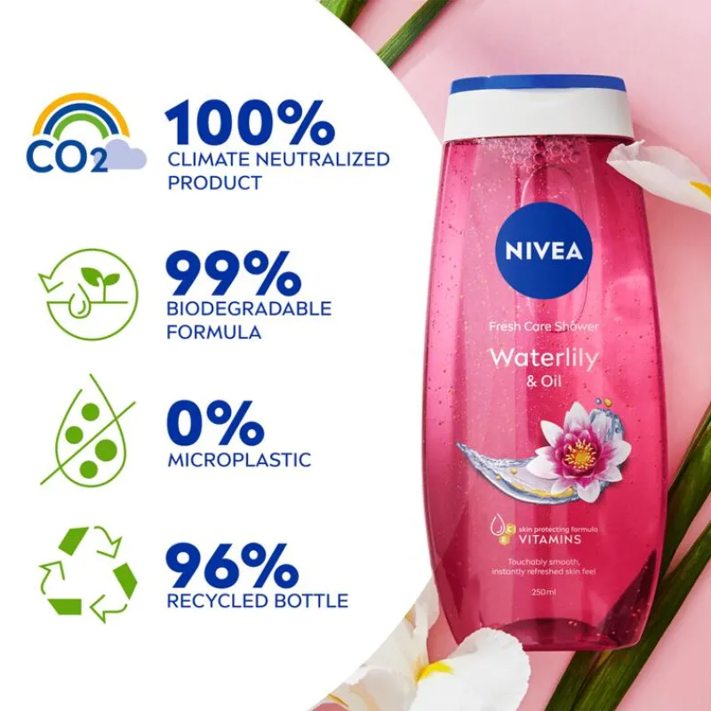 Ervaar een verfrissend verwenmoment met NIVEA Waterlily & Oil Douchegel 250ml. Deze luxe douchegel combineert de kalmerende geur van waterlelie met verzorgende vitamine C en E, aangevuld met fijne olieparels voor een voelbaar gladde, gehydrateerde huid. De pH-huid neutrale formule is dermatologisch goedgekeurd en helpt uitdroging voorkomen, waardoor hij perfect is voor dagelijks gebruik. Bovendien is de formule 99% biologisch afbreekbaar en 100% klimaatneutraal. De fles bestaat voor 96% uit gerecycled materiaal*, zodat je niet alleen goed zorgt voor je huid, maar ook voor het milieu. Geniet van een frisse, zachte huid en een heerlijke geur die je zintuigen prikkelt – elke douche een verwenmoment.