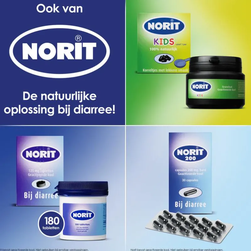 Diarree is hele dunne ontlasting die meerdere keren op een dag plaatsvindt. Diarree kan plotseling ontstaan en gaat vaak gepaard met buikkrampen, braken of koorts. Een heel vervelend en ongemakkelijk probleem waar je snel van af wilt. Gebruik daarom Norit tablettenNorit is generaties lang het vertrouwde merk bij diarree. Voor volwassenen en kinderen. Norit is 100% natuurlijk. De werkzame stof is actieve kool. Dit is een 100% plantaardige natuurlijke kool dat ervoor zorgt dat de schadelijke stoffen die diarree veroorzaken op een natuurlijke wijze het lichaam verlaten zodat je lichaam weer normaal gaat functioneren. Norit verwijdert niet alleen de oorzaak van diarree, het herstelt en reinigt ook de darmen. Hierdoor verdwijnt de diarree en wordt de ontlasting weer normaal.