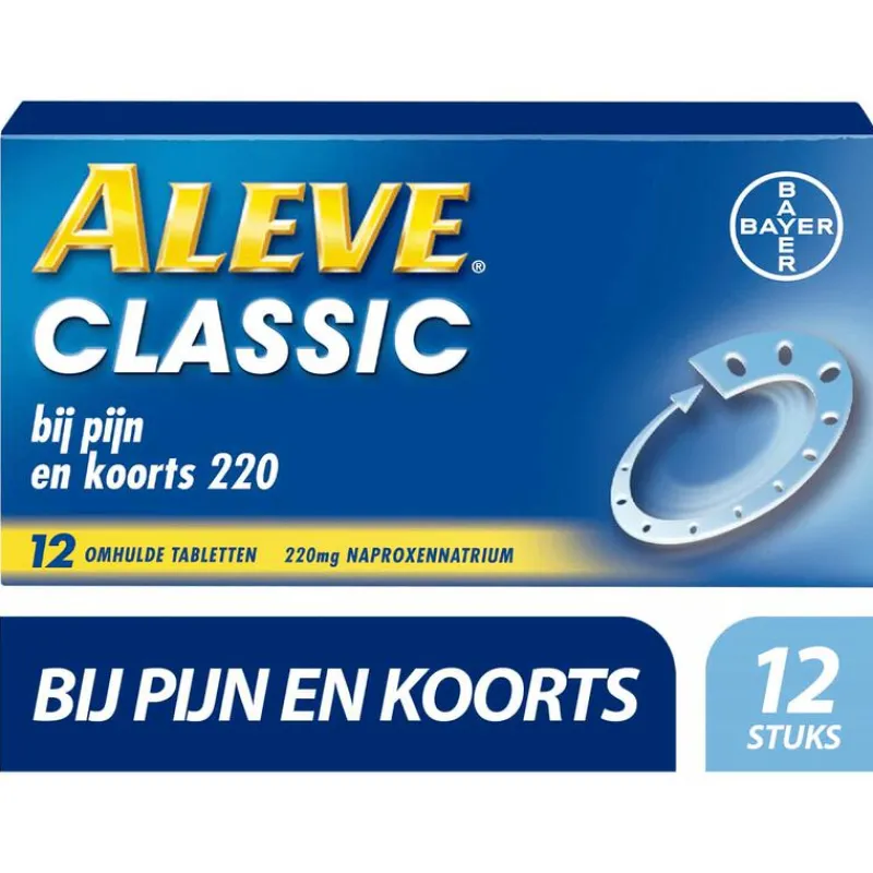 Aleve Classic werkt snel en langdurig tegen pijnen die wat langer kunnen aanhouden, zoals hoofdpijn, griep en verkoudheid, tand- en kiespijn, koorts en bij pijn na vaccinatie. Deze pijnstillers werken ontstekingsremmend en koortsverlagend. De dosering van Aleve Classic, namelijk 220 mg naproxennatrium, is bewezen effectief voor het verlichten van de wat mildere pijnklachten bij, hoofdpijn, griep en verkoudheid, tand- en kiespijn, koorts en bij pijn na vaccinatie. De dosering is maximaal 3 tabletten per dag en maximaal 2 tabletten per dag bij een leeftijd vanaf 65 jaar. Afhankelijk van de intensiteit van de pijn kan worden begonnen met 2 tabletten, na 12 uur kan dan nog 1 tablet worden genomen. Er kan ook voor worden gekozen om om de 8 uur één tablet te nemen. Aleve Classic werkt langer dan Ibuprofen en de kleine, gladde tabletjes zijn gemakkelijk door te slikken. U kunt de tabletten innemen met bijvoorbeeld water en bij voorkeur onmiddellijk na de maaltijd.Aleve Classic 220mg, naproxennatrium: niet te gebruiken bij maag-, darm- en andere bloedingen, maagpijn, gelijktijdig gebruik van antistollingsmiddelen en ernstig hartfalen.