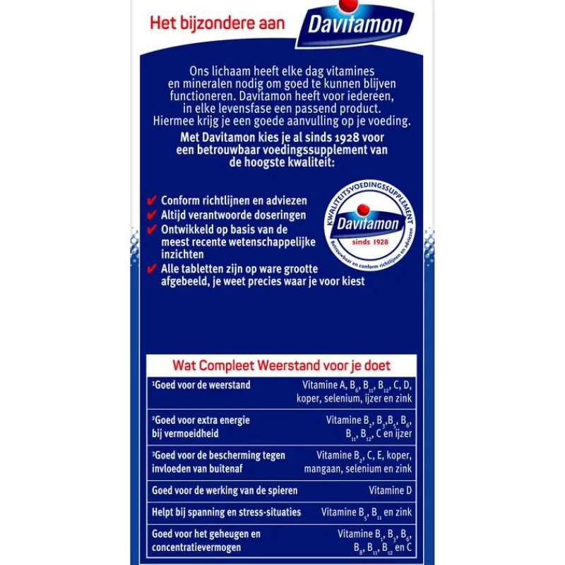 DAVITAMON COMPLEET WEERSTAND is speciaal ontwikkeld voor volwassenen en bevat een combinatie van verschillende vitamines en mineralen. Hierdoor hebben de tabletten een unieke werking. Zo zijn ze: